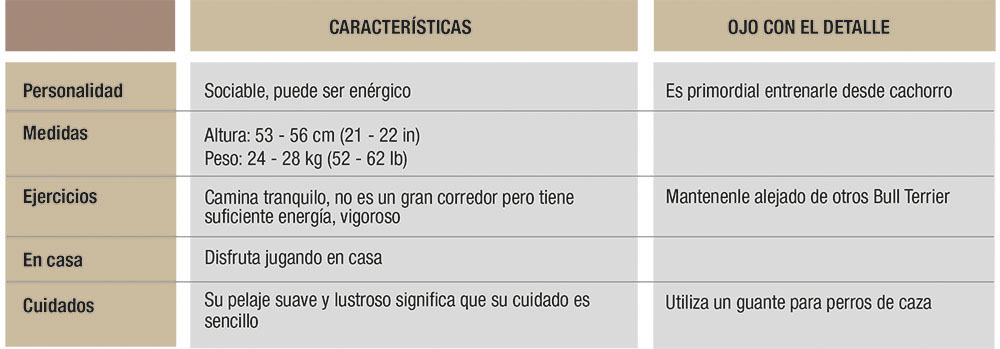 Es el más adecuado para familias con adolescentes. Esto se debe, sobre todo, a que es muy enérgico y debido a la fuerza que tiene, un Bull Terrier adulto puede resultar difícil de controlar por niños pequeños si éste empieza a tirar de la correa. Se recomienda castrarlos para disminuír cualquier instinto agresivo persistente hacia otros perros mientras que un entrenamiento riguroso y una adaptación a la sociedad a una edad temprana ayudarán a asegurar que el cachorro evolucione en un perro adulto adaptado y sociable. El Bull Terrier tiene un lado muy juguetón pero prepárese para buscar juguetes resistentes, ya que sus poderosa: mandíbulas los destrozarán sin ninguna dificultad.