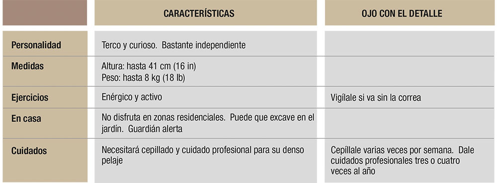También mostrará otra de sus características, su deseo para cavar. El entrenamiento puede resultar difícil, a pesar de que como recompensa, tendrás un perro muy independiente y animado en vez de un perro faldero. No son recomendables para un hogar con niños pequeños, ya que a veces pueden tener mal genio.